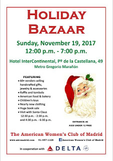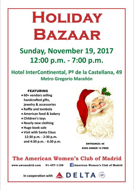 El domingo 19 noviembre participamos también como otros años en el BAZAR NAVIDEÑO AWC que organizan el club de mujeres americanas de Madrid. Esto será en Hotel Intercontinental – Paseo de la Castellana, 49 de Madrid en horario de 12:00 a 19:00h. Como siempre ambientado con motivos navideños y la presencia de un embajador de Papa Noel.